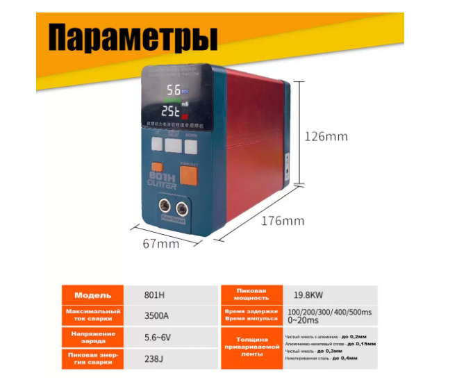 - Аппарат Glitter 801H - 1 шт. - Ручка точечной сварки S-75A - 1 шт. - Приставка для сварки в вертикальном положении S73A - 1 шт. - Педаль управления - 1 шт. - Адаптер питания с евровилкой - 1 шт. - Пластиковая База для работы с кронштейном. - 1 шт. - Медные сварочные электроды для кронштейна 73SA - 2 пары. - Медные сварочные электроды для выносной ручки S-75A - 1 пара. - Шестигранный ключ. - Никелевая лента 0,15*8*100мм - 20шт. - Никель-алюминиевая лента 0,15*10*100мм - 20шт. -