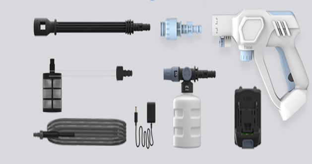 Мойка 1 шт. Пенообразователь - 1 шт. Шланг 5 м. Батарея - 1 шт. Зарядное устройство - 1 шт