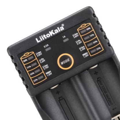 Имеет LED-индикаторы, отображающие процесс заряда 25%-50%-75%-100% и тип аккумулятора (1.2В Ni-MH, 3.2В Li-Fe, 3.7В Li-ion, 3.85В Li-ion).